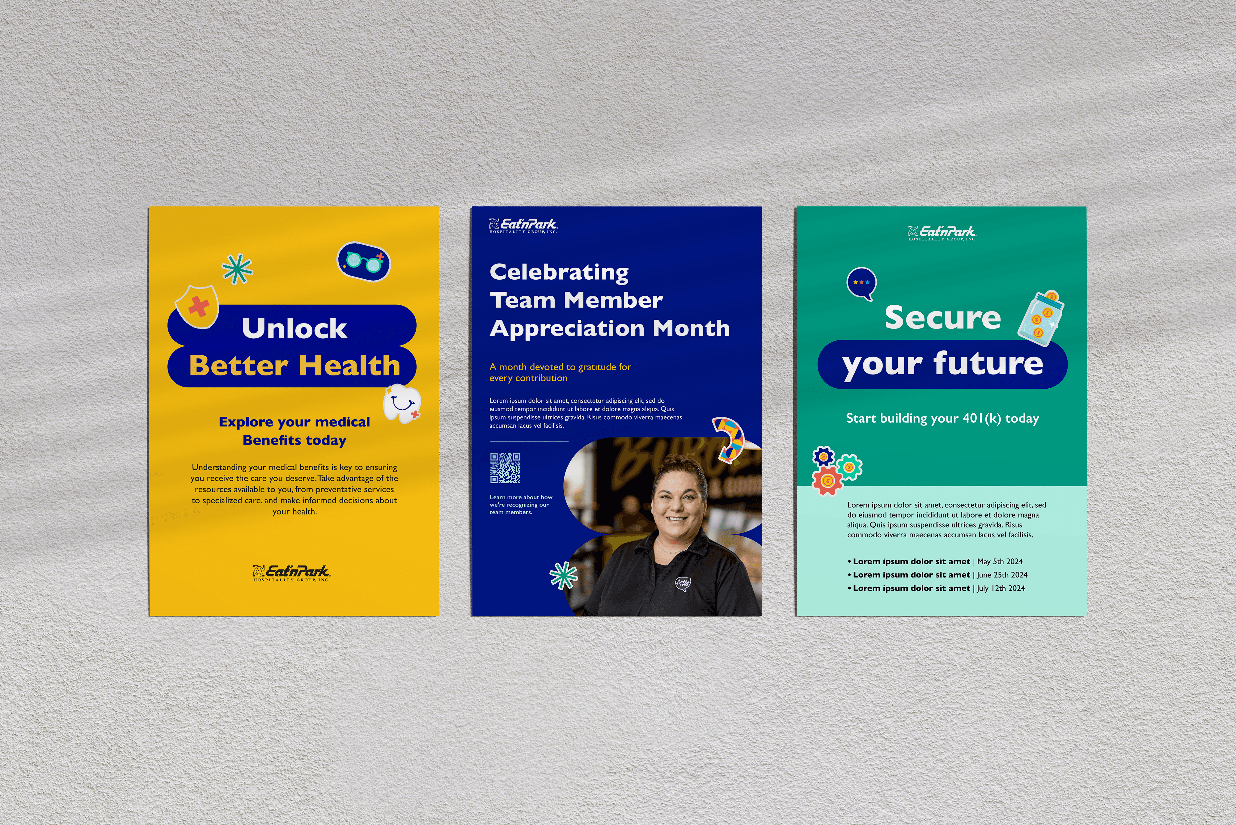 Eat’n Park needed an internal communication system that non-designers could use confidently. Existing materials were inconsistent, hard to read, and often left employees unsure about key details like Open Enrollment dates or benefits information. To better understand the environment, I interviewed team members to learn how they created and shared content. These insights shaped the goal: build a system that was intuitive, modular, easy to use, and expressive of the brand’s personality, while keeping communications consistent across locations.
