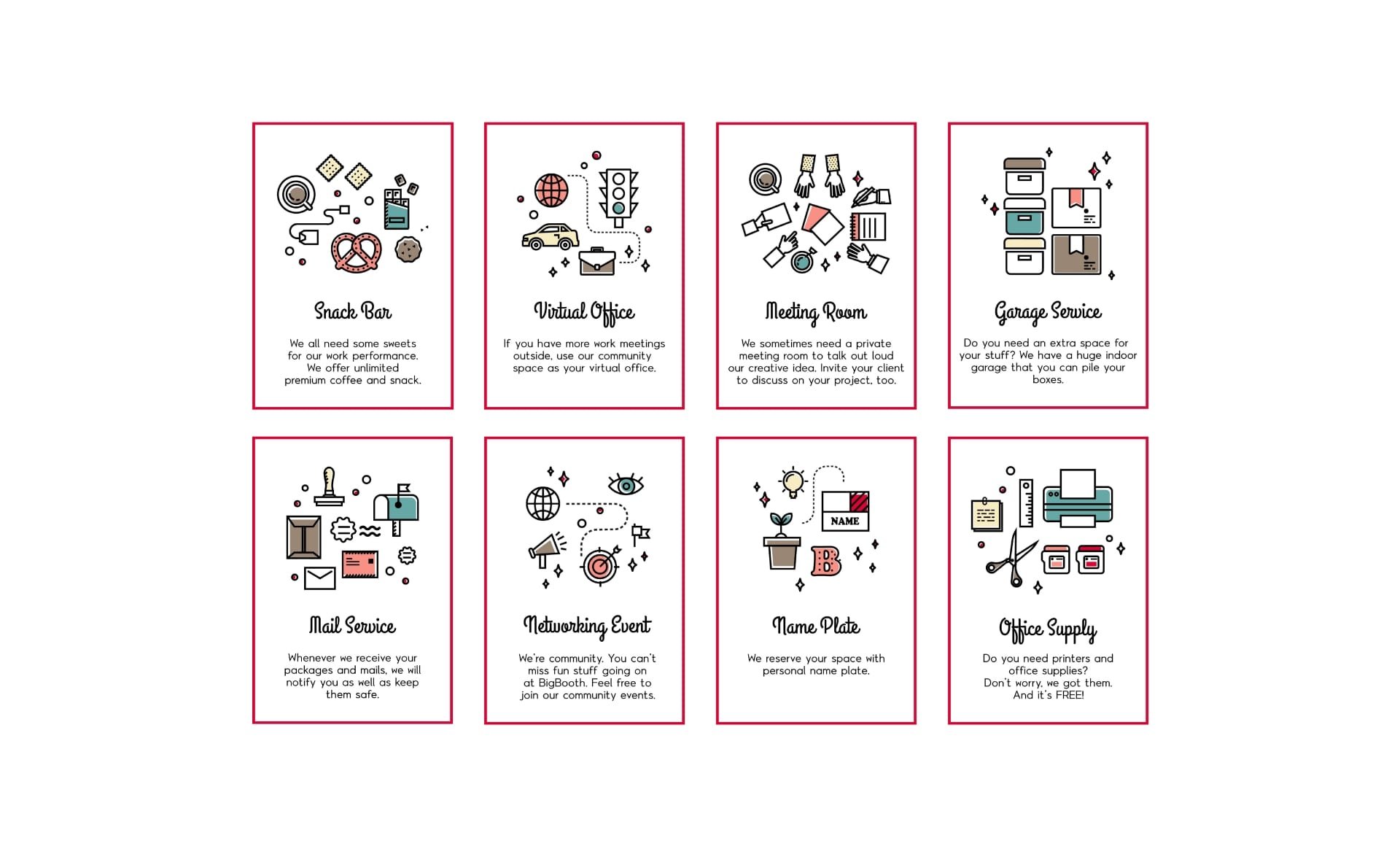 Bigbooth is an open, flexible coworking space designed for individuals, small teams, and entrepreneurs to grow their businesses through collaboration. The challenge was to develop a brand identity that captured the energy, openness, and collaborative spirit of the space while creating an approachable and engaging environment. The website also needed to attract new members and showcase the community, maintaining consistency across all touchpoints.